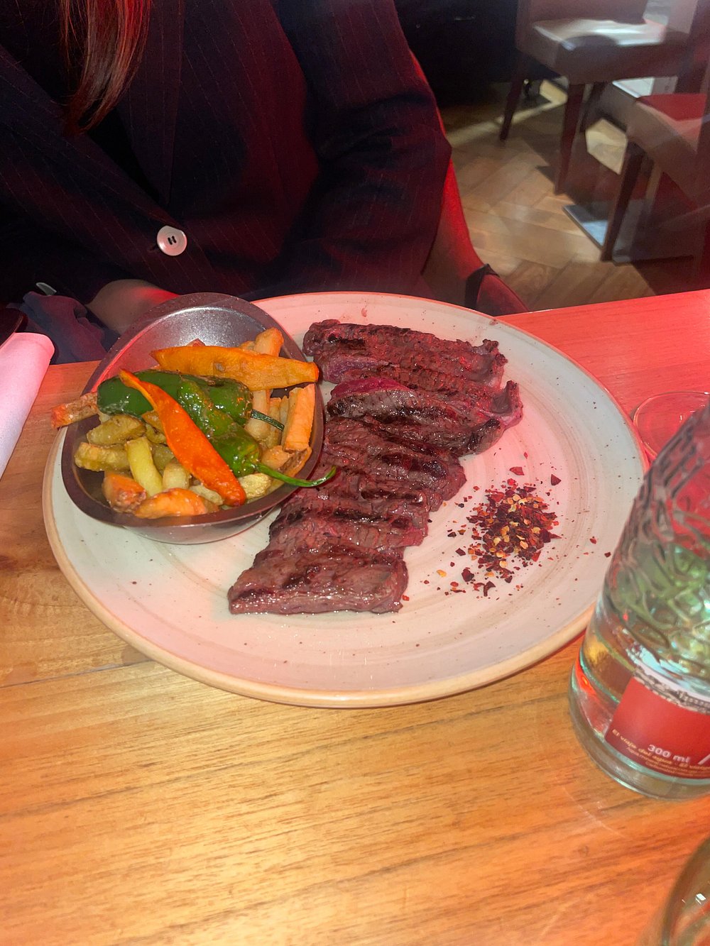 Paella, pescado y carnes asadas al carbón en un restaurante refinado con decoración tropical y terraza con vegetación.