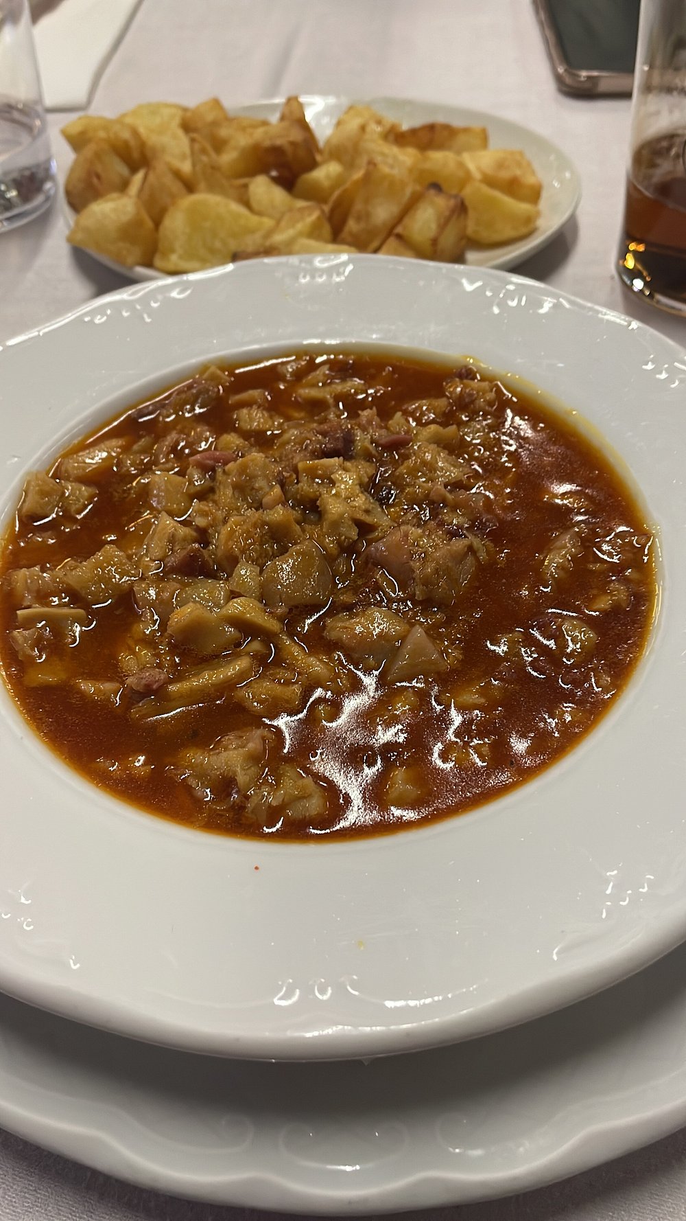 Estofados asturianos contundentes, salchichas y carnes, servidos con vinos regionales, en una taberna rústica del siglo XIX.