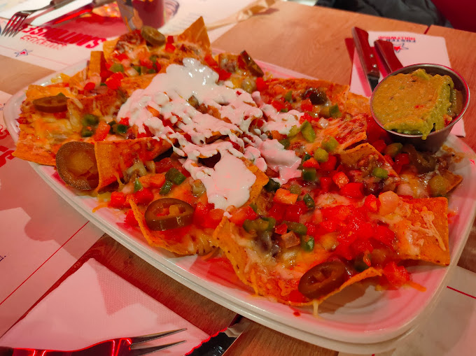 Hamburguesas y comida típica americana y tex-mex en cadena de dinero con decoración industrial y de películas