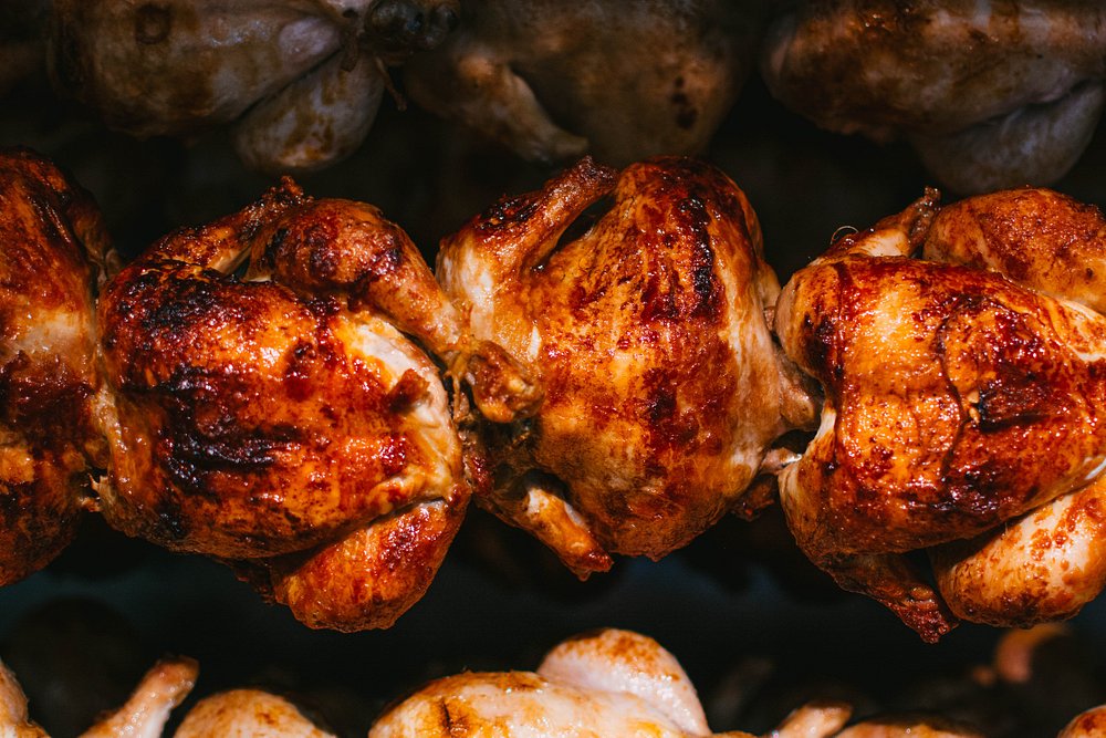 Pollos asados y cocina casera en una cervecería de barrio con mostrador de platos preparados para llevar.