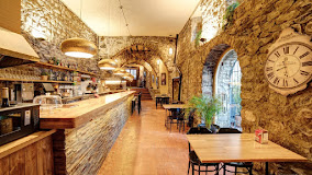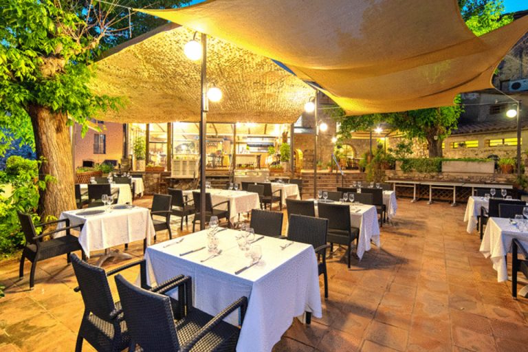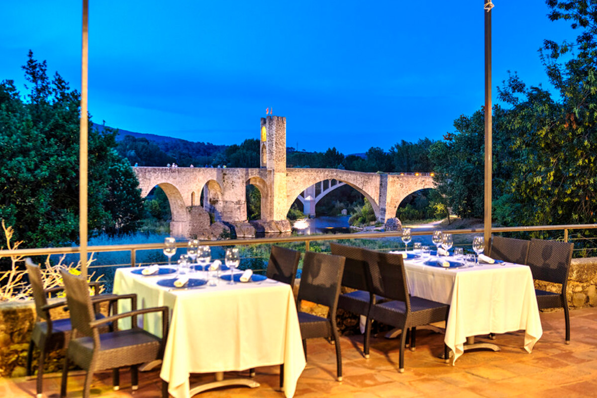 Tapas y platos principales creativos y de cocina catalana en un restaurante de estilo rústico con paredes de piedra vista y terraza.