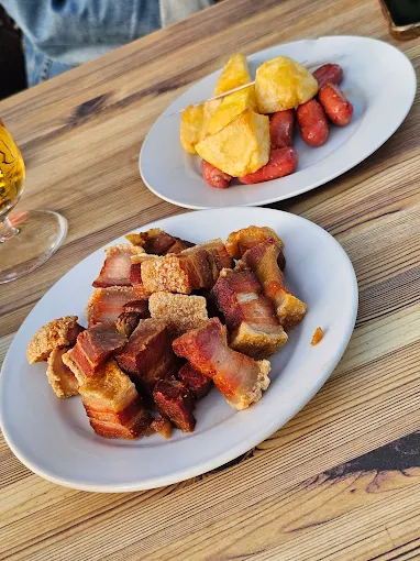 Clásico bar renovado con toneles como mesas y barra de baldosa para setas y y carnes a la parrilla de leña.