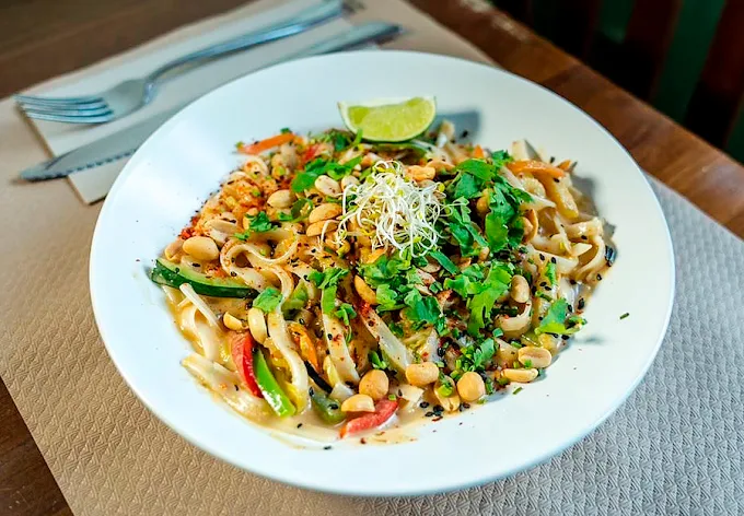 Platos veganos y vegetarianos en un restaurante informal y luminoso con terraza.